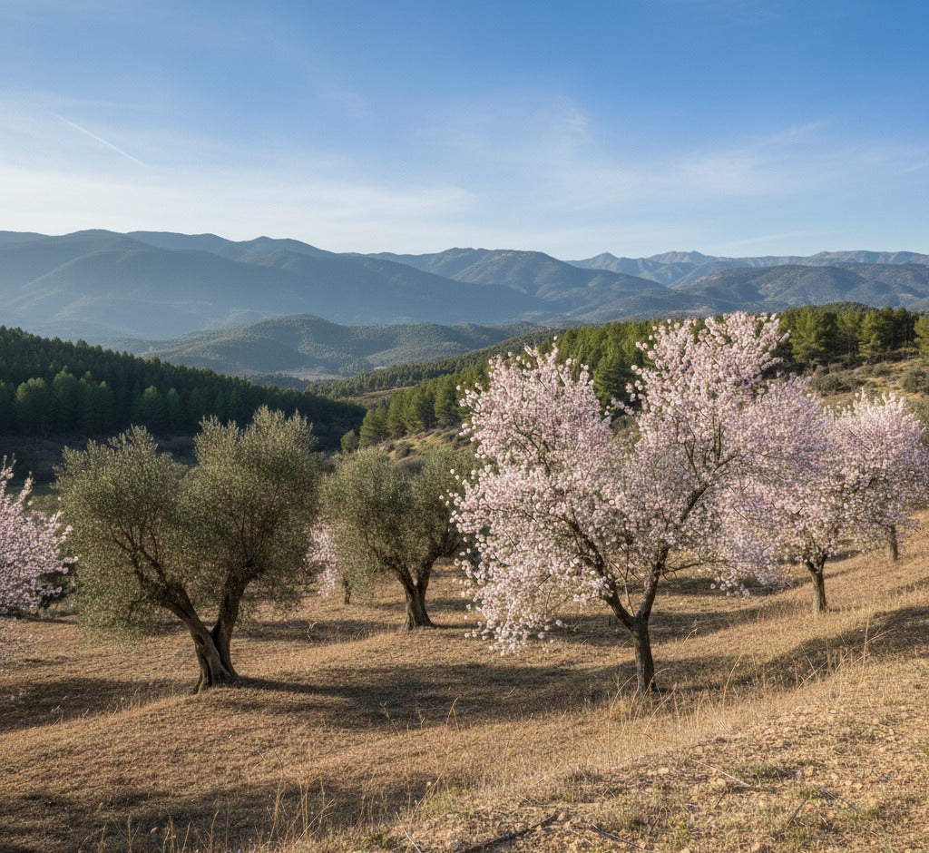 Unsere sorgfältig ausgewählten Olivenbäume zwischen 30 und 50 Jahren teilen sich das Land harmonisch mit Mandelbäumen, schaffen so eine bienenfreundliche Oasis voller Wildblumen und Wildkräuter. Diese Mischwirtschaft ist nicht nur nachhaltig, sondern auch ein Paradies für Bienen und andere Bestäuber. Jeder Baum wird traditionell in Trichterform geschnitten - eine jahrhundertealte Technik, die optimale Lichtverhältnisse garantiert und jedem Zweig die Chance gibt, die beste Frucht zu entwickeln.